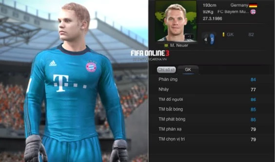 Chỉ số GK của Neuer WC sau cập nhật ra sao? Thấp nhất là điểm nhảy: ‘chỉ’ 77! Còn lại, các chỉ số khác đều từ 79 trở lên! Trong đó, ‘xanh’ nhất là Phản ứng (84), đổ người (86), bắt bóng (85), phát bóng (85).