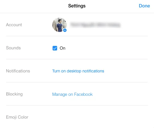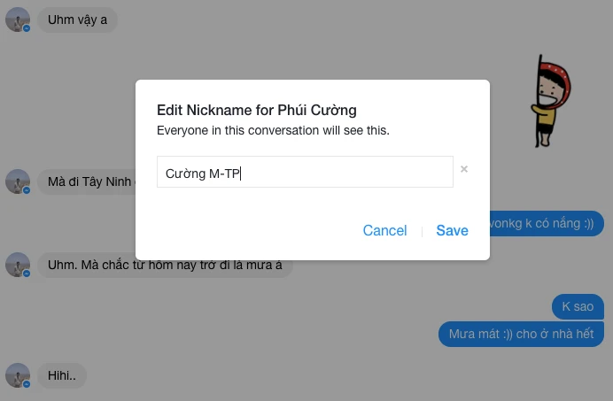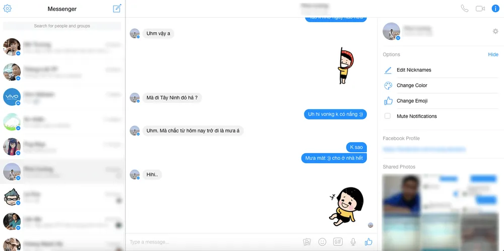 Với dịch vụ Messenger trên nền web, bạn sẽ có thể tùy chỉnh được rất nhiều thứ bao gồm màu sắc cuộc trò chuyện (Change Color), đặt biệt danh cho bạn bè (Edit Nicknames), thay đổi biểu tượng cảm xúc (Change Emoji) hoặc ẩn khung thông tin ở bên tay phải bằng cách chạm vào biểu tượng chữ “i”.