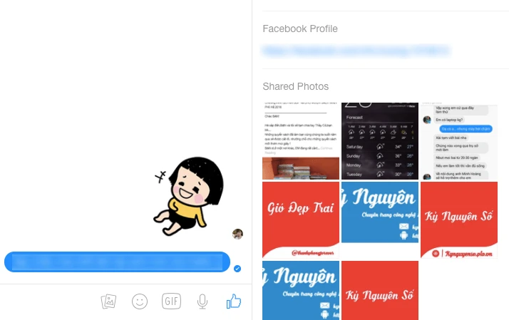 Không giống như giao diện chat trên trên Facebook, dịch vụ Messenger sẽ có một khung nhỏ bên phải, hiển thị toàn bộ các thông tin và hình ảnh mà hai người đã chia sẻ trước đó. Điều này khá hữu ích, cho phép bạn dễ dàng theo dõi mọi thứ liên quan đến tình yêu hoặc các dự án công việc mà không cần phải lục lại trong tin nhắn.