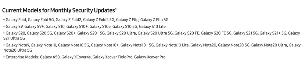 Danh sách các thiết bị Samsung được nhận bản cập nhật hàng tháng. Ảnh: TIỂU MINH
