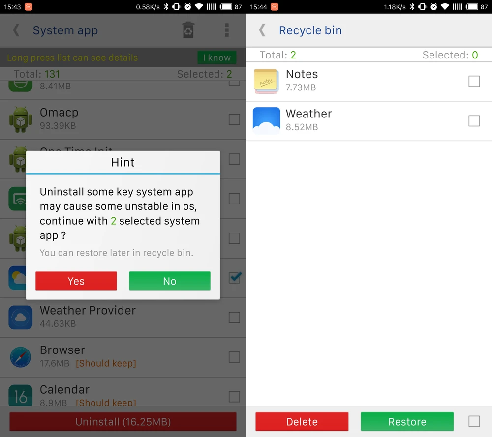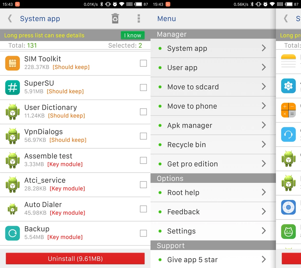 Giao diện của System app remover khá đơn giản, các ứng dụng được phân loại thành hai mục riêng biệt gồm System app (ứng dụng hệ thống) và User app (ứng dụng do người dùng cài đặt). Lưu ý, bạn không nên gỡ bỏ những ứng dụng được đánh dấu Should keep hoặc Key module bởi việc này có thể gây ảnh hưởng đến hệ thống.