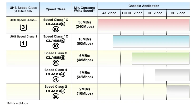 Speed Class là tốc độ ghi tối thiểu của một chiếc thẻ nhớ, tính bằng megabytes/giây (MBps). Speed Class có bốn chuẩn gồm: