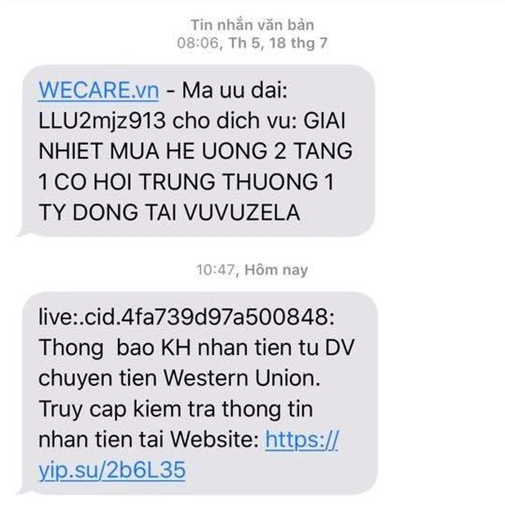- Tin nhắn lừa đảo: Tội phạm mạng sẽ gửi tin nhắn trúng thưởng có chứa liên kết dẫn đến các trang web giả mạo (có địa chỉ và giao diện gần giống với trang web chính thức của ngân hàng, tổ chức tài chính, trung gian thanh toán...) và yêu cầu người dùng đăng nhập tài khoản ngân hàng để nhận tiền.