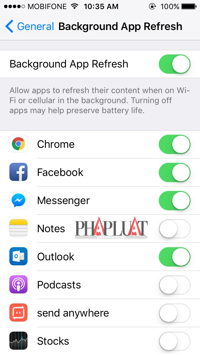 Để tắt bớt các tính năng không cần thiết, bạn hãy vào Settings > General > Background App Refresh. Người dùng có thể tắt hoàn hoặc chỉ vô hiệu hóa tính năng chạy nền cho từng ứng dụng để tiết kiệm pin và dữ liệu 3G đắt đỏ.