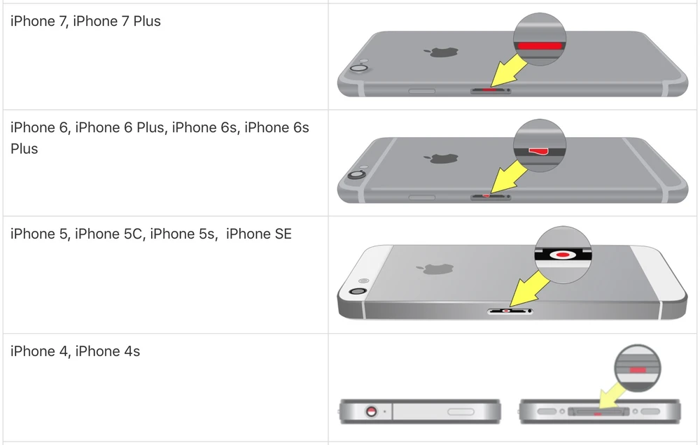 Trên các thiết bị iOS, Apple đã tích hợp sẵn cảm biến Liquid Contact Indicators (LCI) nhằm kiểm soát việc điện thoại có vô nước hay chưa. Người dùng có thể tìm thấy cảm biến này ở gần khu vực pin hoặc khe cắm SIM (tùy từng dòng điện thoại). Thông thường LCI sẽ có màu trắng hoặc xám, khi điện thoại bị vô nước, nó sẽ chuyển sang màu đỏ. Theo Apple, cảm biến này sẽ không đổi màu khi độ ẩm hoặc nhiệt độ thay đổi. Đây cũng là một cách đơn giản để kiểm tra smartphone có bị vô nước khi bạn đi mua điện thoại cũ.