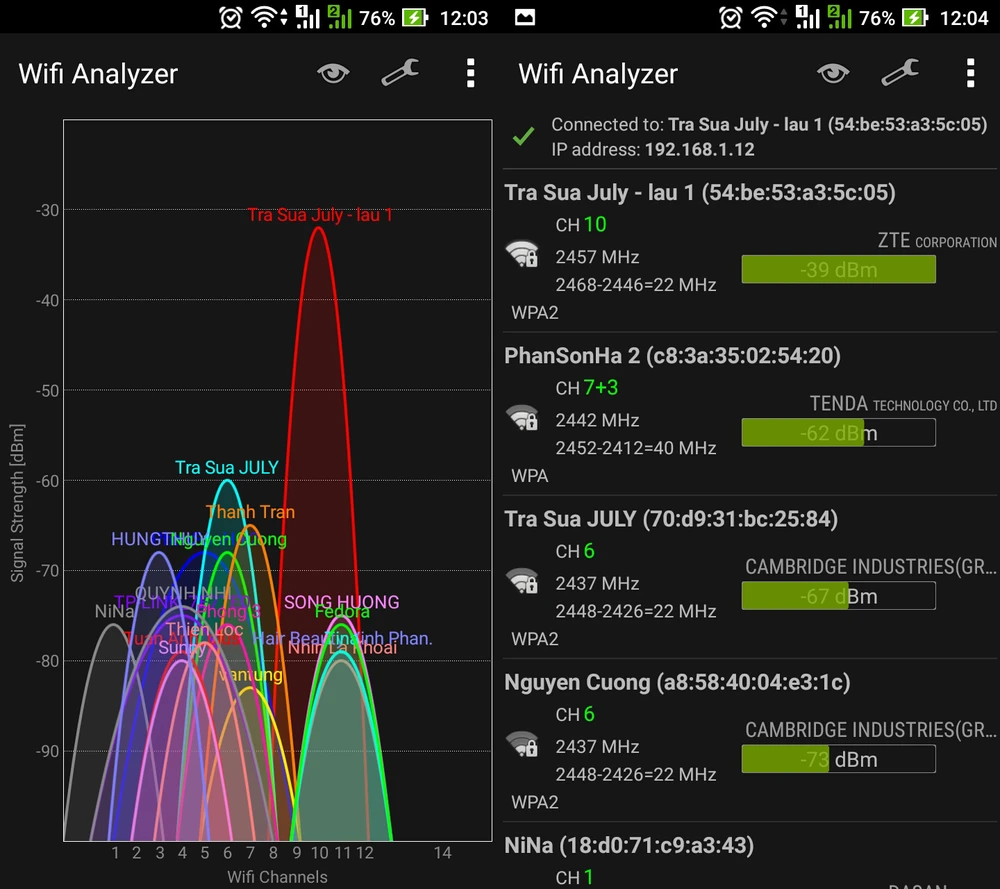 Nếu đang sống tại chung cư, chắc hẳn tín hiệu WiFi nhà bạn sẽ bị ảnh hưởng bởi các hộ lân cận. Để hạn chế tình trạng trên, người dùng có thể cài đặt phần mềm Wifi Analyzer cho smartphone tại địa chỉ https://goo.gl/iMgZn, tương thích với các thiết bị Android 2.3 trở lên. Về cơ bản, ứng dụng sẽ liệt kê thông tin về tín hiệu (signal), kênh (channel) của tất cả các mạng lân cận. Khi hoàn tất, bạn chỉ cần truy cập vào router và chuyển sang kênh kết nối có ít người sử dụng.