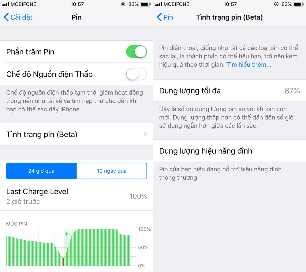 Bên cạnh đó, người dùng cũng có thể kiểm tra sức khỏe trên iPhone bằng cách nâng cấp lên iOS 11. Khi cài đặt thành công, người dùng chỉ cần vào Settings (cài đặt) > Battery (pin). Tại đây, bạn sẽ xuất hiện thêm một tùy chọn mới là Battery Health (tình trạng pin). Khi nhấp vào, người dùng có thể biết được sức khỏe của viên pin ở thời điểm hiện tại (Maximum Capacity - dung lượng tối đa). Ví dụ như hình bên dưới, viên pin trên iPhone của người viết còn khoảng 87% hiệu suất so với ban đầu, vẫn đảm bảo hiệu năng và không bị chậm thiết bị.