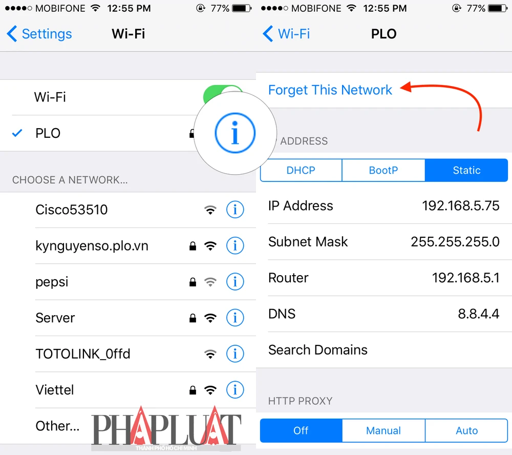 Giải pháp này sẽ xóa toàn bộ các thông tin liên quan đến mạng Wi-Fi mà bạn đang kết nối gồm địa chỉ IP, mật khẩu… Việc bạn cần làm là truy cập vào Settings > Wi-Fi, chạm vào biểu tượng chữ (i) nằm bên cạnh tên mạng và chọn Forget this network > Forget.