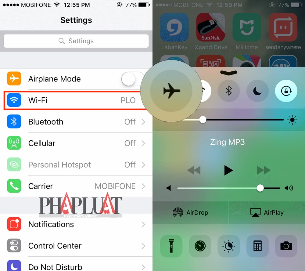 Tắt/Bật Wi-Fi hoặc chuyển iPhone tạm thời sang chế độ máy bay. Ảnh: M.HOÀNG