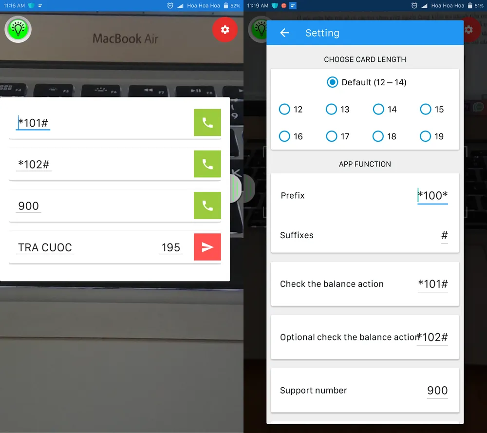 Trước đây, để nạp card điện thoại, chúng ta thường phải cào thẻ và thực hiện mọi thứ theo cách thủ công. Việc này khá tốn thời gian, thay vào đó người dùng chỉ cần cài đặt ứng dụng Card Scan (http://bit.ly/2JYPPHu) để nạp card nhanh bằng camera. Đầu tiên, bạn hãy mở Card Scan và đưa thẻ cào đến gần để ứng dụng nhận diện. Khi hoàn tất, người dùng chỉ cần nhấn nút gọi để nạp card nhanh, các thông số như *100* và # ở đầu, cuối đã được điền sẵn.