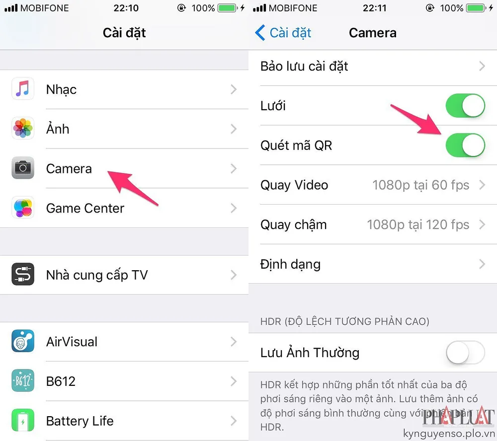 Hiện nay QR Code được sử dụng ở khá nhiều nơi từ kinh doanh, quảng cáo, chia sẻ mật khẩu WiFi… hay kết nối đến một trang web. Để kích hoạt tính năng quét QR Code trên iOS 11, bạn hãy vào Settings (cài đặt) > Camera (máy ảnh) > Scan QR Code (quét mã QR). Kể từ lúc này, người dùng chỉ cần mở ứng dụng Camera trên iPhone là đã có thể quét QR Code nhanh hơn mà không cần phải cài đặt thêm các ứng dụng của bên thứ ba. Lưu ý, tính năng này chỉ hoạt động khi bạn sử dụng chế độ Photo và Square.