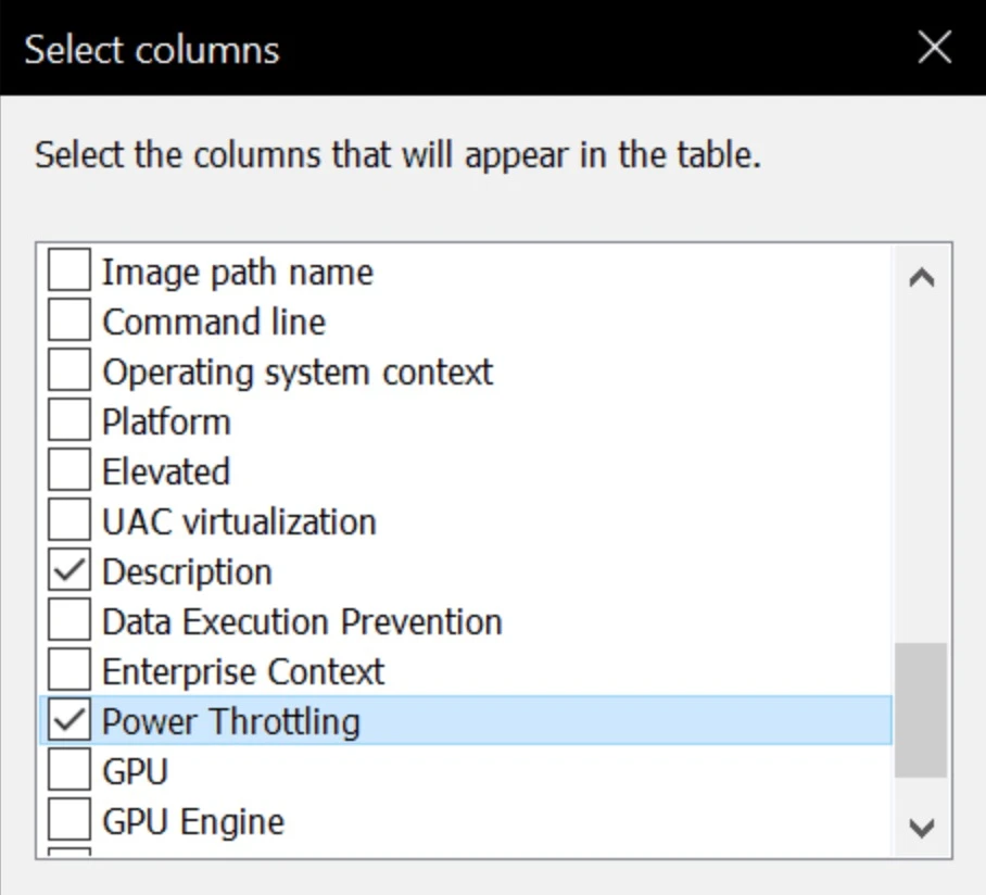 Để kiểm tra danh sách các ứng dụng đang bị ảnh hưởng bởi tính năng Power Throttling, bạn hãy nhấn tổ hợp phím Ctrl + Shift + Esc và chọn Task Manager. Tiếp theo, người dùng chỉ cần chuyển sang thẻ Details, nhấn phải chuột vào một cột bất kì và chọn Select Columns, sau đó đánh dấu vào ô Power Throttling.