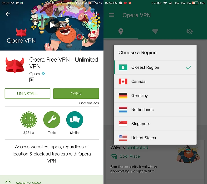 Khi hoàn tất, bạn hãy nhấn Connect, lựa chọn máy chủ tương ứng như Canada, Germanu, Singapore, United States hoặc Closest Region (khu vực gần nhất). Nếu muốn tắt VPN, bạn hãy trượt thanh thông báo từ trên xuống, chọn Opera VPN và nhấn Disconnect.