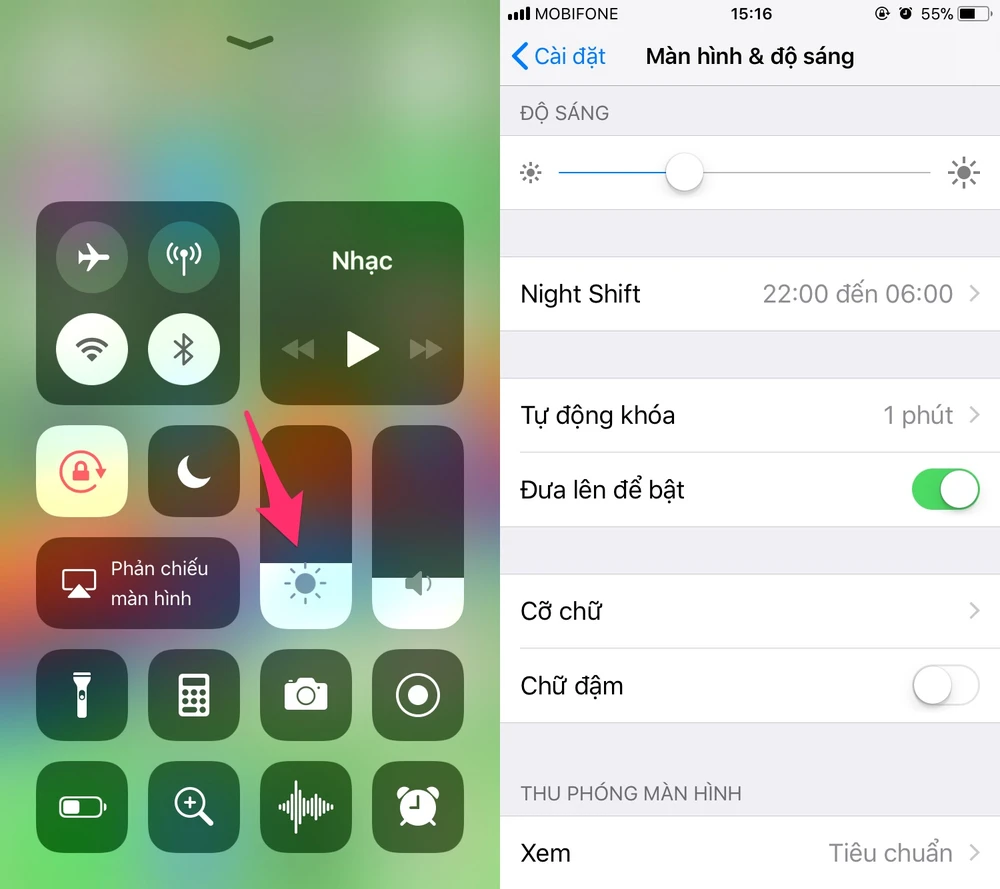 Độ sáng màn hình là một trong những yếu tố ảnh hưởng lớn đến thời gian sạc pin. Do đó, nếu muốn giảm thời gian sạc pin, người dùng chỉ cần giảm độ sáng màn hình về mức vừa phải hoặc thấp nhất thông qua Control Center hoặc truy cập vào Settings (cài đặt) > Display & Brightness (màn hình & độ sáng).