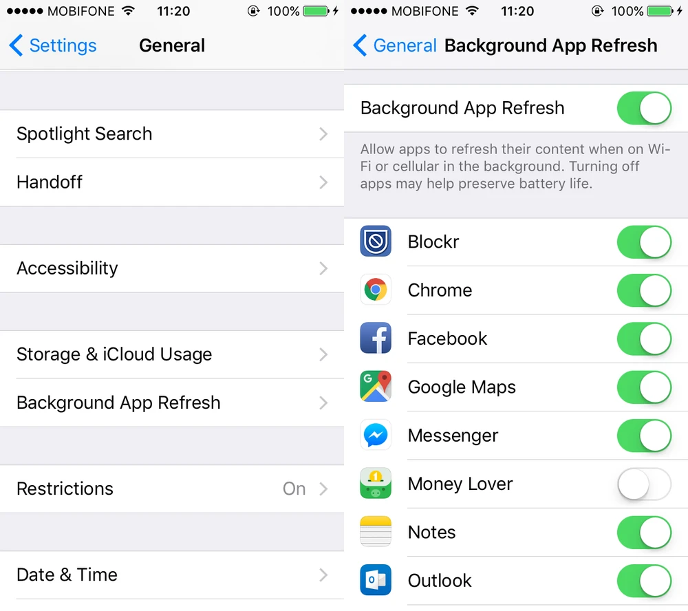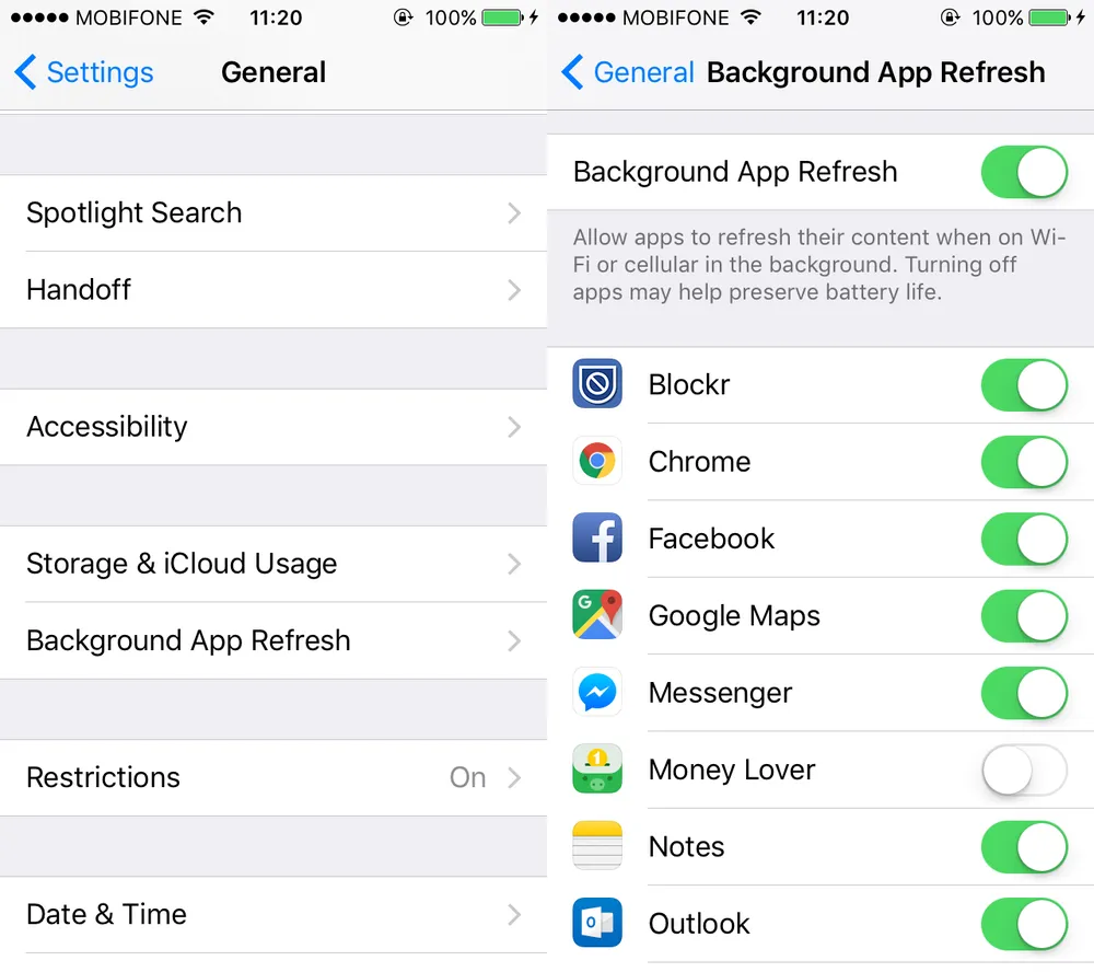 Facebook, Messenger hay Snapchat đều là những ứng dụng “ngốn” rất nhiều pin trên iPhone. Về cơ bản, đa số các ứng dụng trên đều chạy nền để “làm mới” thông tin, giúp bạn không bỏ lỡ các thông báo quan trọng. Tuy nhiên, nếu cảm thấy không cần thiết, người dùng có thể vô hiệu hóa bằng cách truy cập vào phần Settings (cài đặt) trên iPhone, chọn General (cài đặt chung) > Background Apps Refresh (làm mới ứng dụng trong nền) và vô hiệu hóa các ứng dụng tương ứng.