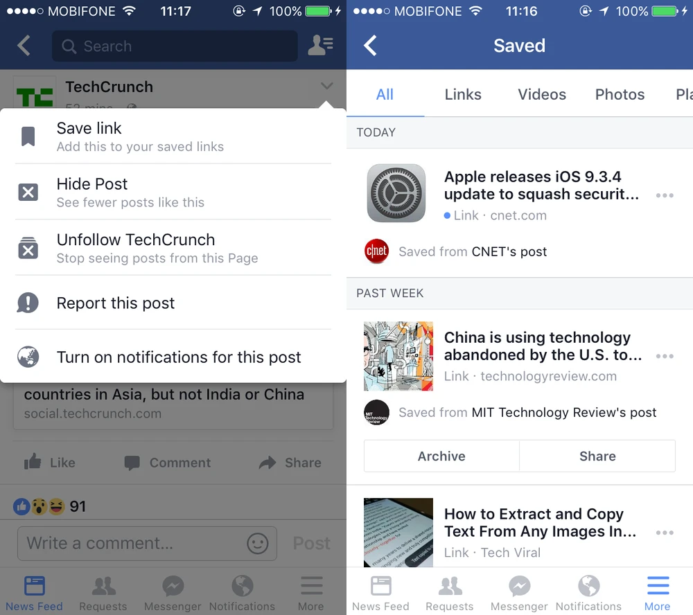 Khi sử dụng Facebook, bạn có thể lưu lại các bài viết, liên kết trang hoặc video để xem lại sau bằng cách chạm vào biểu tượng mũi tên ở góc phải bài viết và chọn Save link (lưu liên kết) hoặc Save video (lưu video). Nếu muốn xem lại những thứ đã lưu, người dùng chỉ cần vào mục More (thêm) > Saved (đã lưu).