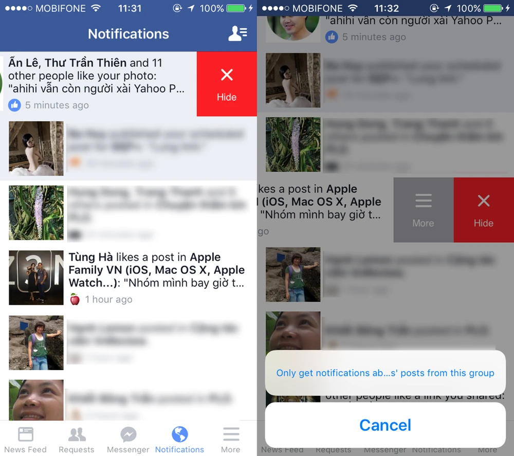 Khi bị tag vào một cuộc trò chuyện trên Facebook, bạn sẽ phải nhận rất nhiều thông báo không mong muốn. Do đó, người dùng có thể vô hiệu hóa bằng cách truy cập vào mục Notifications (thông báo), vuốt sang trái rồi chọn Hide (ẩn) hoặc More để tắt thông báo từ một trang hay một người cụ thể.