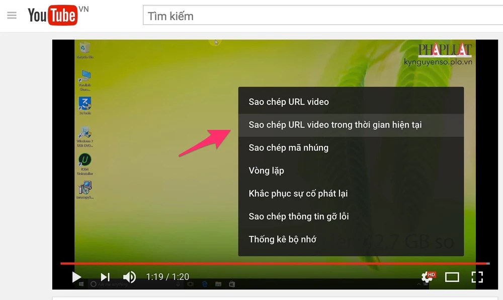 Ví dụ, nếu bạn muốn chia sẻ video này bắt đầu từ khúc 1 phút 10 giây thì làm như sau: https://www.youtube.com/watch?v=lK8_guOwmIE&t=1m10s. Ngoài ra, người dùng cũng có thể tạm dừng video tại thời điểm muốn chia sẻ, sau đó nhấp phải chuột và chọn Sao chép URL Video trong thời gian hiện tại.