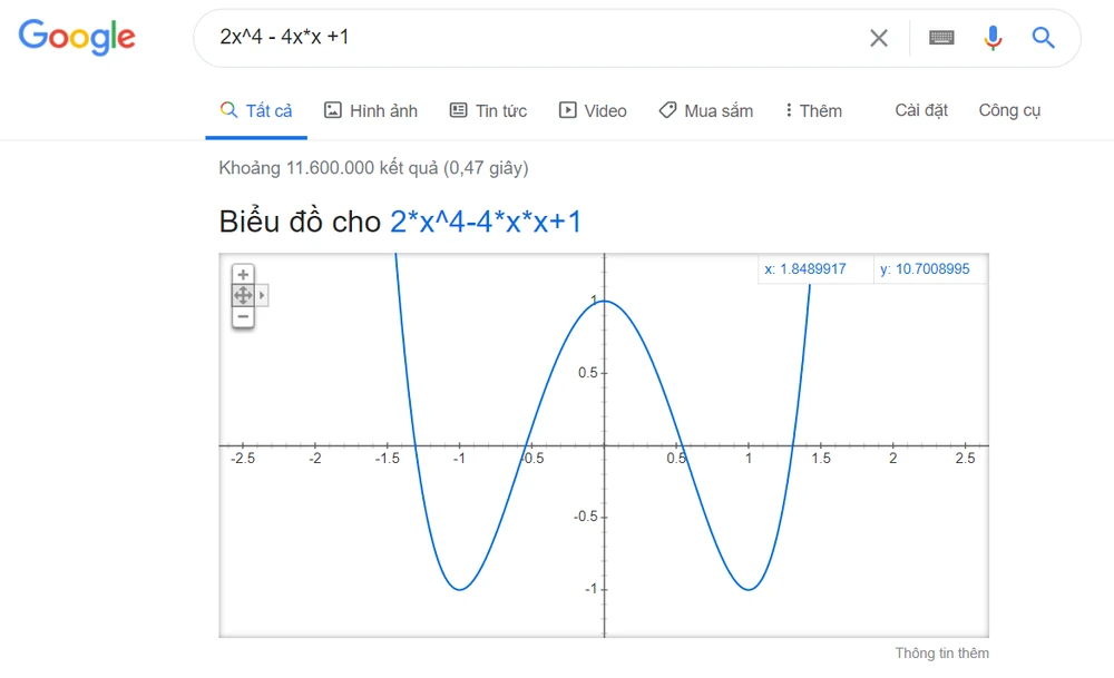 Tuy nhiên, vẫn còn một thứ nữa mà Google làm được, còn máy tính bỏ túi thì không, đó là kiểm tra kết quả đồ thị hàm số. Bạn chỉ cần nhập hàm số, Google sẽ trả về hình dạng đồ thị tương ứng.