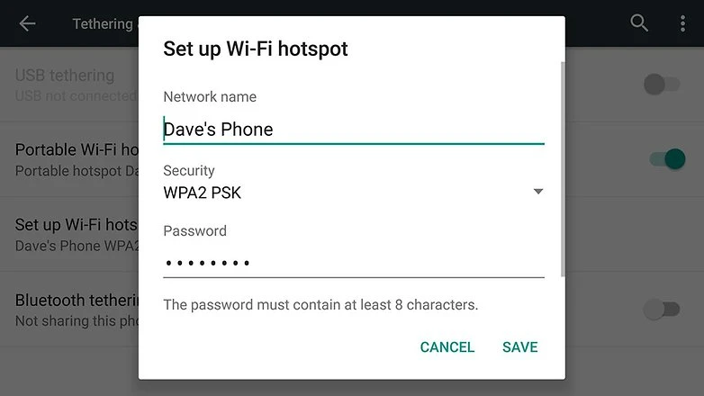 Tethering là một tính năng khá hay, cho phép bạn biến smartphone thành điểm truy cập Wi-Fi miễn phí. Để kích hoạt, đầu tiên bạn cần truy cập vào Settings > More > Tethering & portable hotspot. Đặt tên mạng, lựa chọn giao thức mã hóa ở phần Security, sau đó thiết lập mật khẩu truy cập để đảm bảo an toàn.