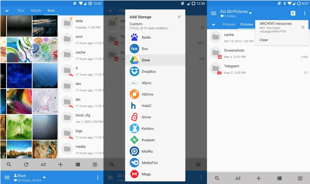 Mixplorer là một ứng dụng quản lý tập tin với đầy đủ chức năng cần thiết, hỗ trợ hầu hết các tất cả các loại tệp, đi kèm theo đó là trình xem ảnh, phát nhạc và hỗ trợ hơn 19 nhà cung cấp dịch vụ đám mây bao gồm Google Drive, One Drive,…