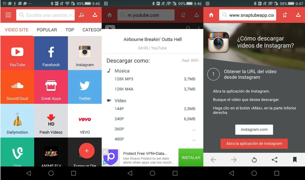 Snaptube là ứng dụng quản lý và hỗ trợ tải xuống các tập tin đa phương tiện tốt nhất trên Android. Về cơ bản, nó cho phép bạn tải xuống video từ bất kì trang web hoặc mạng xã hội nào bao gồm Facebook, Twitter, Instagram, YouTube, Sound Cloud, Vimeo,… và nhiều hơn nữa. Bạn cũng có thể tải xuống các tệp dưới dạng âm thanh (nếu có) và phát mọi thứ ngay từ ứng dụng.