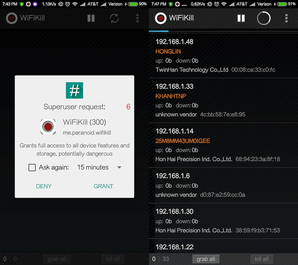 WiFiKill là ứng dụng duy nhất trong danh sách này yêu cầu quyền truy cập root để có thể hoạt động và nó cũng là một trong những ứng dụng hữu ích nhất trong danh sách. Về cơ bản, WiFiKill sẽ quét và hiển thị toàn bộ thiết bị đang kết nối vào WiFi tại nhà, đồng thời cho phép người dùng chặn truy cập của những thiết bị đáng ngờ (nghi ngờ xài chùa WiFi).
