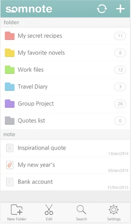Đây là một ứng dụng ghi chú tuyệt đẹp, với giao diện người dùng gọn gàng và sạch sẽ. SomNote cung cấp một trải nghiệm tuyệt vời trong khi không ảnh hưởng gì đến chức năng của ứng dụng. Cho phép bạn tạo ra các thư mục và lưu lại các ghi chú trong đó một cách có tổ chức, như vậy bạn sẽ đỡ mất thời gian hơn khi tìm kiếm. Đặc biệt, SomNote còn hỗ trợ người dùng đính kèm tập tin đa phương tiện có dung lượng lên đến 1GB.