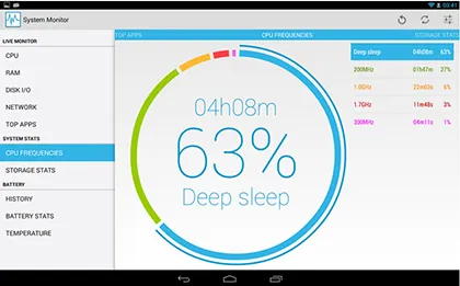 Tương tự như System Monitor, bạn cũng có thể xem thông tin về nhiệt độ, dữ liệu pin và bộ nhớ RAM, CPU. Mặc dù các thiết bị Android không tạo ra nhiều các tập tin rác như trên máy tính, nhưng bạn vẫn có thể lấy lại được vài trăm MB bằng cách xóa bộ nhớ cache của ứng dụng, những thư mục tải về, nội dung clipboard và nhiều hơn nữa.