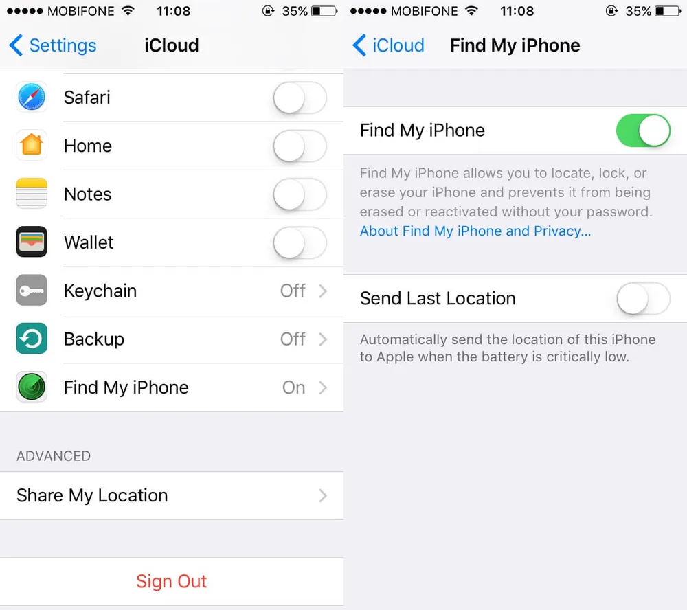 Cuối cùng trong danh sách này là Find My iPhone, một tính năng được tích hợp sẵn trên các thiết bị iOS. Cho phép người dùng theo dõi và xác định vị trí hoặc xóa toàn bộ dữ liệu từ xa. Để kích hoạt, bạn hãy vào Settings > iCloud > Find My iPhone.