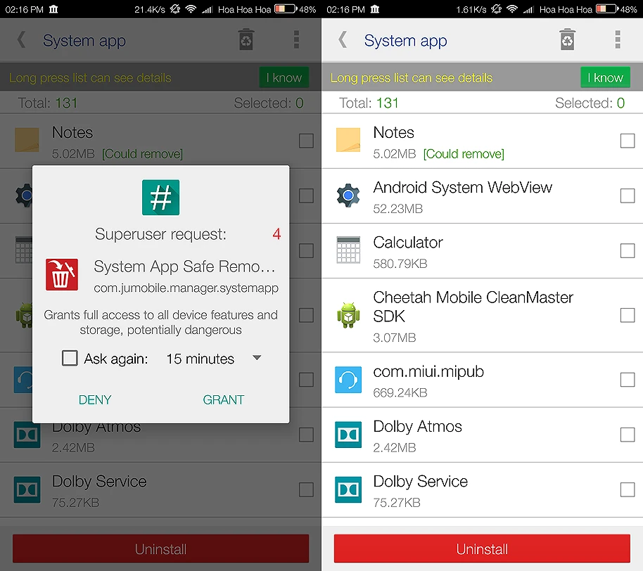 Đầu tiên, bạn hãy tải và cài đặt ứng dụng System App Remover tại địa chỉ http://bit.ly/2IIwRnT, yêu cầu thiết bị đã root trước đó. Những ứng dụng có ghi chú Could remove đồng nghĩa với việc bạn có thể gỡ bỏ. Ngược lại, bạn hãy hạn chế tác động lên các ứng dụng có ghi chú Key module hoặc Should keep. Cuối cùng, bạn chỉ cần đánh dấu chọn vào các ứng dụng thừa rồi nhấn Uninstall để gỡ bỏ khỏi hệ thống.