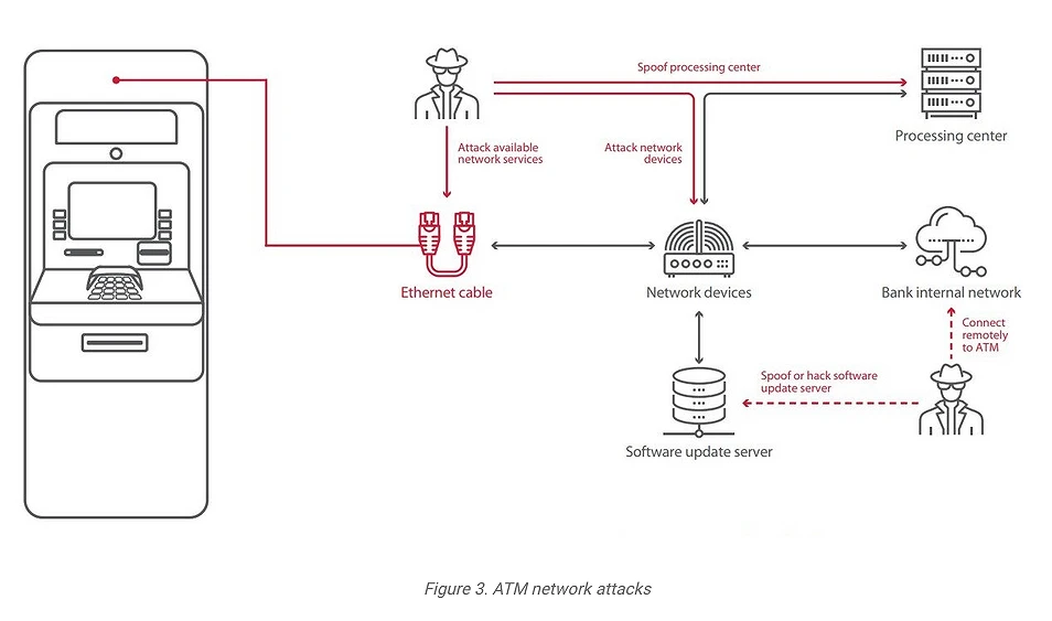 Sau khi xâm nhập vào máy ATM, kẻ gian có thể tấn công trực tiếp vào các dịch vụ đang chạy hoặc tấn công trung gian, cho phép họ ngăn chặn và sửa đổi các gói dữ liệu được gửi về trung tâm xử lý. Các biện pháp an ninh được triển khai để bảo vệ máy ATM thường chỉ gây một ít phiền toái cho kẻ tấn công.