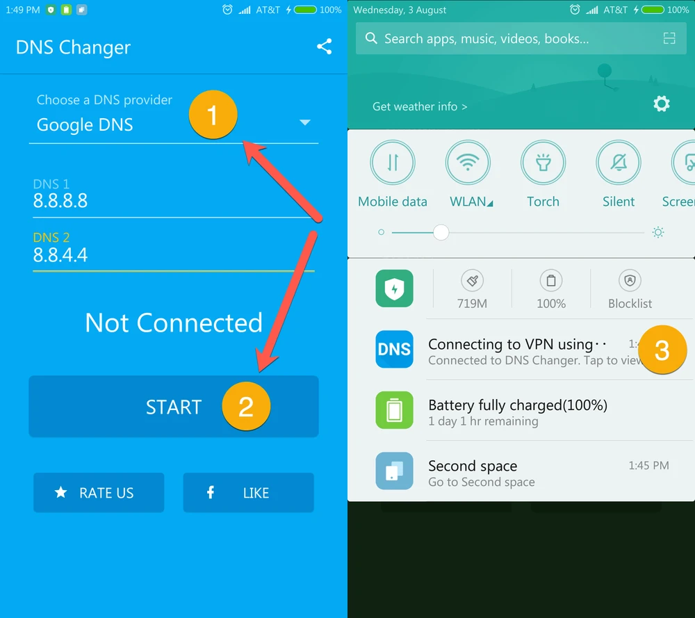 - Android: Tương tự, bạn hãy cài đặt ứng dụng DNS Changer cho smartphone tại địa chỉ https://goo.gl/3q9LEz. Giao diện của chương trình tương đối đơn giản, người dùng chỉ cần lựa chọn nhà cung cấp DNS phổ biến như Google, Open, Yandex hoặc Custom để tự cấu hình các thông số. Sau đó nhấn Start để thay đổi DNS, tình trạng kết nối sẽ được hiển thị ngay trên thanh thông báo, bạn có thể theo dõi hoặc thay đổi lại chỉ với một cú chạm.