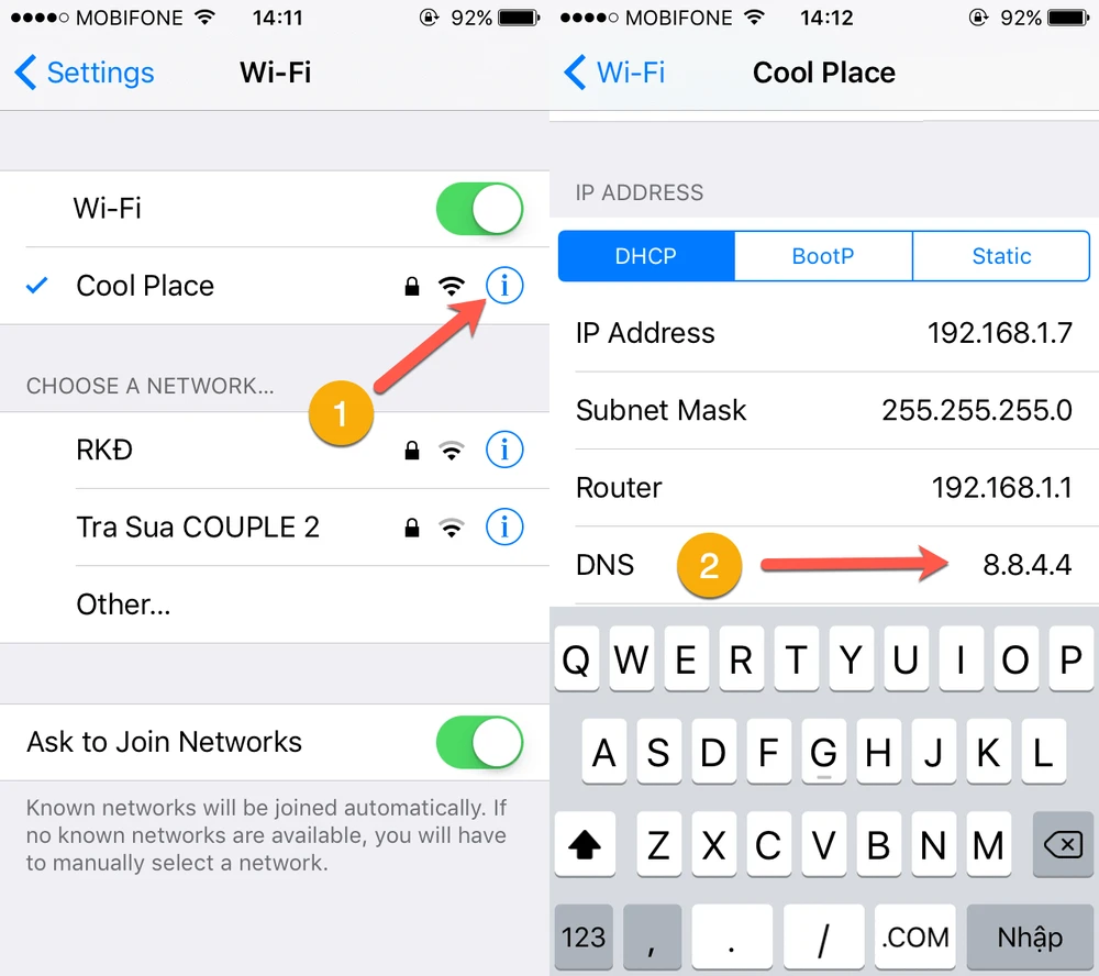 - iOS: Đối với các thiết bị iOS (iPhone, iPad hoặc iPod), bạn hãy vào Settings (cài đặt) > WiFi, chạm vào biểu tượng chữ “i” ở cuối tên mạng, sau đó kéo xuống bên dưới và cấu hình các thông số tương ứng tại mục DNS. Ví dụ, Google DNS (8.8.8.8, 8.8.4.4), Open DNS (208.67.222.222, 208.67.220.220)…