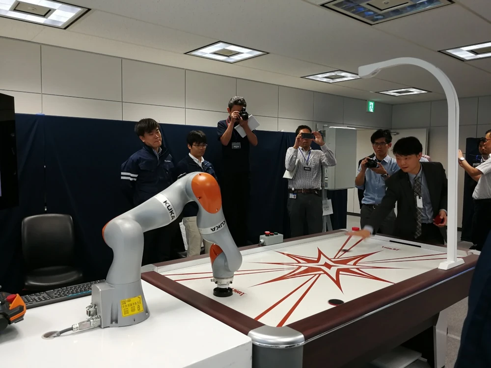 Một cánh tay robot chơi một trò chơi khúc côn cầu (hockey) trên băng với con người trong cuộc trình diễn này. Một camera được cài đặt trên đầu bàn khúc côn cầu trên băng đã phát hiện vị trí của quả bóng để tính toán quỹ đạo của nó. Kết quả tính toán sau đó được chuyển tiếp tới máy chủ điều khiển cánh tay robot. Trong cuộc trình diễn này, cánh tay robot đã có thể đánh lại cú đánh bóng của người chơi bằng nhiều con đường khác nhau. Công nghệ này có thể được áp dụng cho tự động hóa nhà máy.