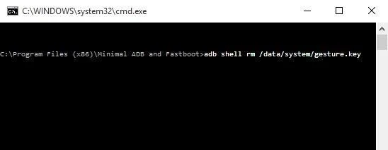 Đầu tiên, bạn hãy kết nối điện thoại với máy tính bằng cáp USB, sau đó mở Command prompt trong thư mục cài đặt ADB và gõ lệnh adb shell rm /data/system/gesture.key rồi nhấn Enter.