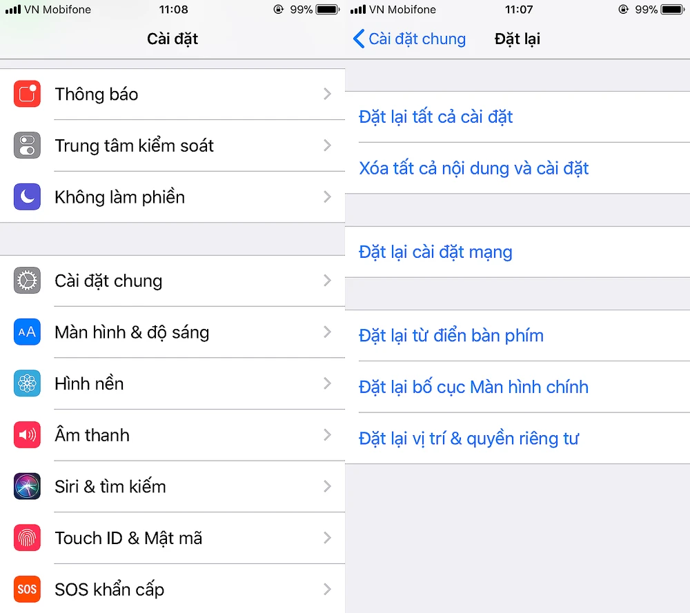Đầu tiên, bạn hãy khởi động lại iPhone, iPad bằng cách nhấn nút nguồn + Home cùng lúc cho đến khi xuất hiện logo Apple trên màn hình. Nếu đang sử dụng iPhone 8 trở lên, bạn chỉ cần vào Settings (cài đặt) > General (cài đặt chung) > Shutdown (tắt máy). Sau đó nhấn im nút nguồn vài giây để mở lại máy (xuất hiện logo Apple). Ngoài ra, khi cắm sạc cho thiết bị, tự động iPhone X hoặc iPhone 8/8 Plus cũng sẽ mở lại.