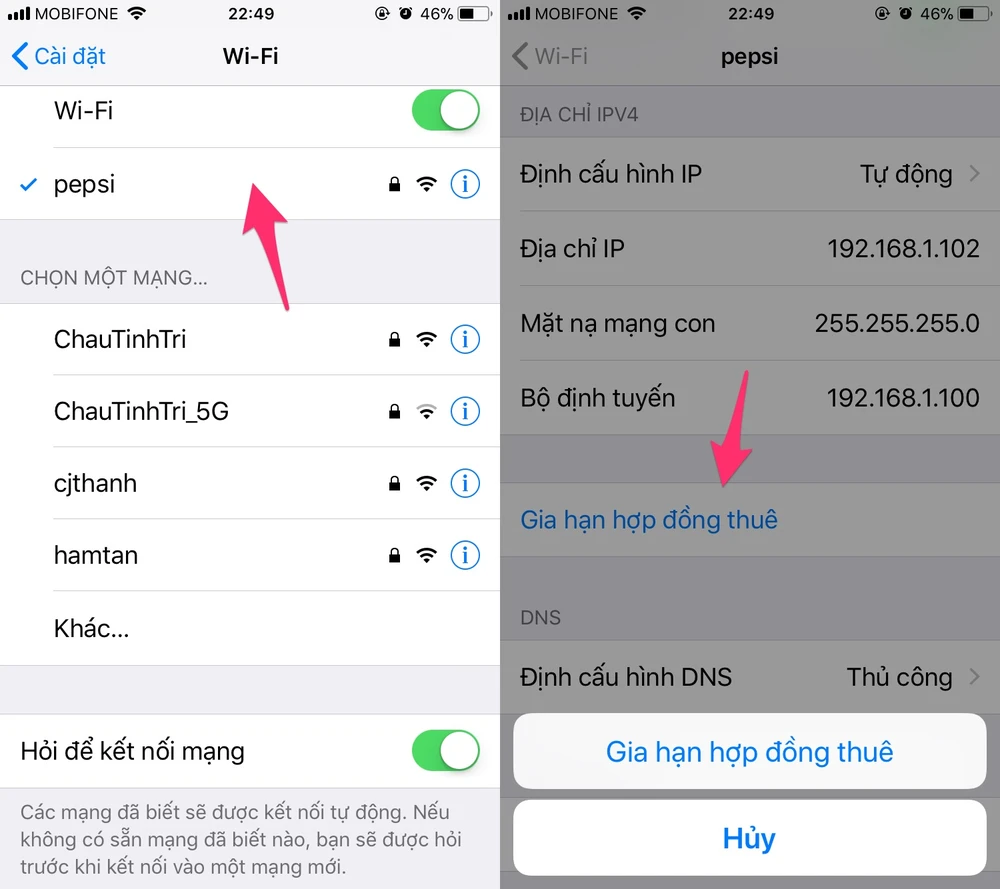 Tắt/bật WiFi là cách đơn giản nhất để khắc phục các lỗi không rõ nguồn gốc. Nếu vấn đề vẫn chưa được khắc phục, bạn hãy truy cập vào phần Settings (cài đặt) > WiFi, bấm vào tên mạng đang gặp sự cố và chọn Renew Lease (gia hạn hợp đồng thuê) > Renew Lease (gia hạn hợp đồng thuê).
