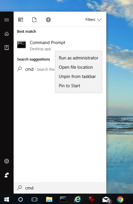 Đầu tiên, bạn hãy nhấn vào biểu tượng nút Start và gõ từ khóa cmd vào khung tìm kiếm, sau đó nhấn phải chuột lên Command Prompt và chọn Run as administrator.