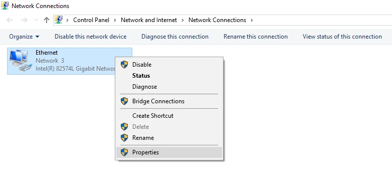Bên cạnh đó, bạn cũng nên nhấn phải chuột vào biểu tượng mạng ở góc phải màn hình và chọn Open Network and Sharing Center > Change adapter settings, nhấn phải chuột lên kết nối đang gặp sự cố và chọn Properties.