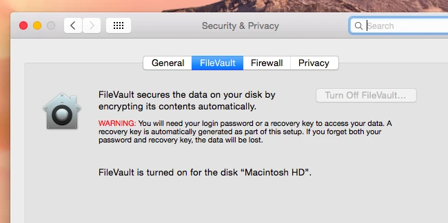 Mac OS X Yosemite muốn bạn cài đặt mã hóa mặc định khi bắt đầu sử dụng. Mọi ổ cứng đều tự động chuẩn bị cho mã hóa FireVault, tự đề nghị kích hoạt khi cài đặt máy Mac mới. Tính năng FileVault của Mac cho phép bạn tải bản sao recovery key đến Apple để khôi phục tập tin qua Apple ID nếu mất mật khẩu. Tuy nhiên, không như Windows 8.1, tính năng này không bắt buộc. Bạn có thể in ra giấy hoặc lưu lại key ở chỗ khác.
