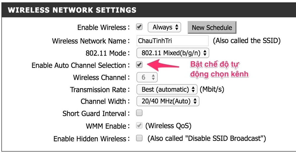 Tiếp theo, bạn hãy tìm đến mục Wireless > Wireless Settings > Channel và thiết lập là Auto để router tự động dò tìm kênh (channel) tốt nhất.