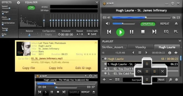 http://www.aimp.ru/AIMP 3 có giao diện đơn giản nhưng cung cấp nhiều tính năng. AIMP 3 phát được nhiều loại định dạng âm thanh, với bộ xử lý âm thanh 32-bit cho chất lượng âm thanh hàng đầu và các hiệu ứng âm thanh tích hợp sẵn. bạn có thể tăng tốc độ, thêm tiếng vang, âm trầm… AIMP 3 cũnng đóng gói chức năng Voice Remover, cho phép bạn tách lời bài hát khỏi nhạc.