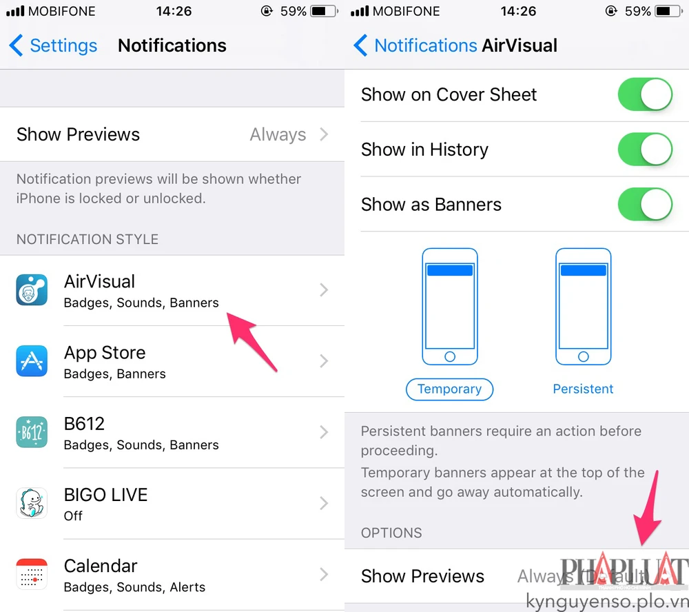 - Notifications: Nếu không muốn người khác đọc lén các thông báo quan trọng, bạn có thể ẩn nhanh mọi thứ trên màn hình khóa bằng cách ấn vào biểu tượng dấu “x” hoặc truy cập vào phần Settings (cài đặt) > Notifications (thông báo) và thay đổi cách hiển thị. Trong khi đó, trên Android người dùng có thể ẩn nhanh thông báo của một ứng dụng bất kì chỉ với vài thao tác đơn giản.