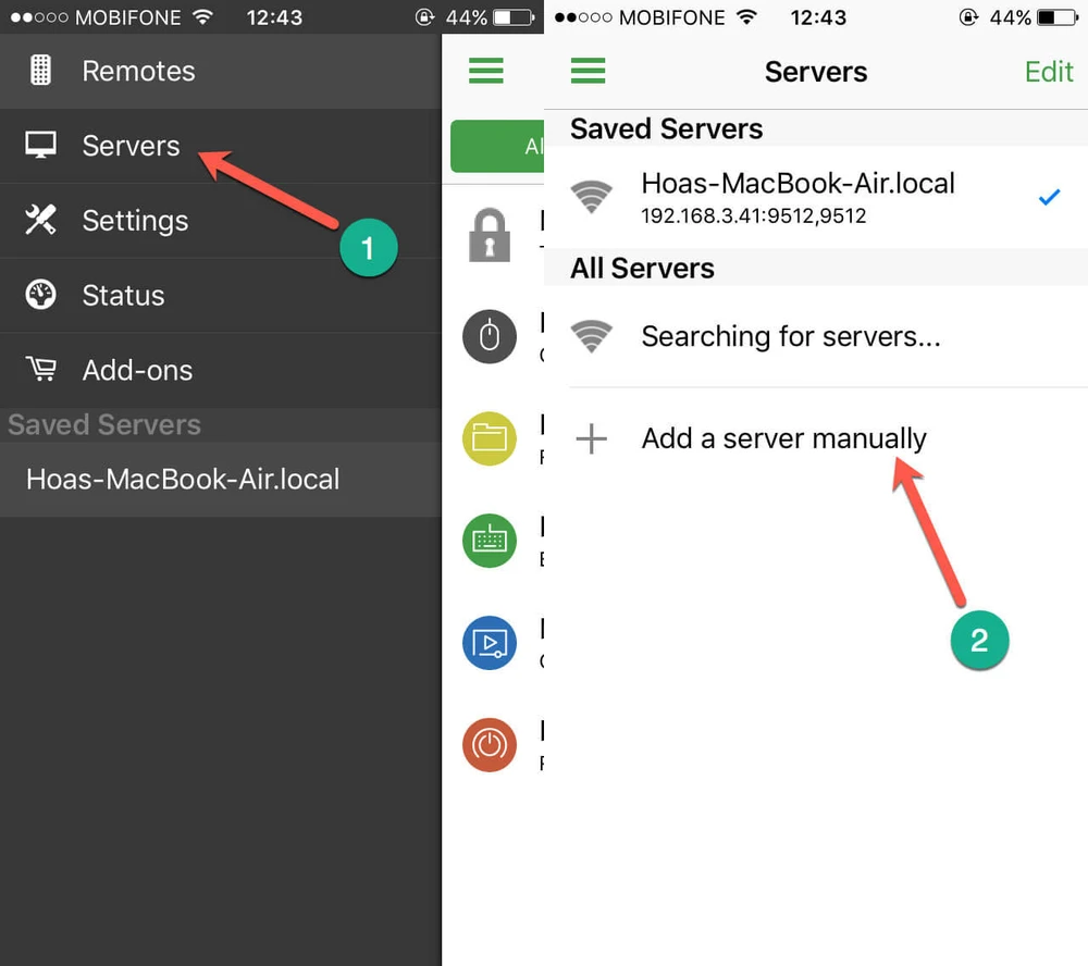 Khi hoàn tất, bạn hãy mở Unified Remote trên smartphone, chạm vào biểu tượng menu ở góc trên bên trái, chọn Server và kết nối với máy tính hoặc thực hiện việc này theo cách thủ công (Add a server manually). Lưu ý, cả smartphone và máy tính đều phải kết nối cùng mạng WiFi, Unified Remote sẽ không hoạt động khi bạn xài 3/4G.