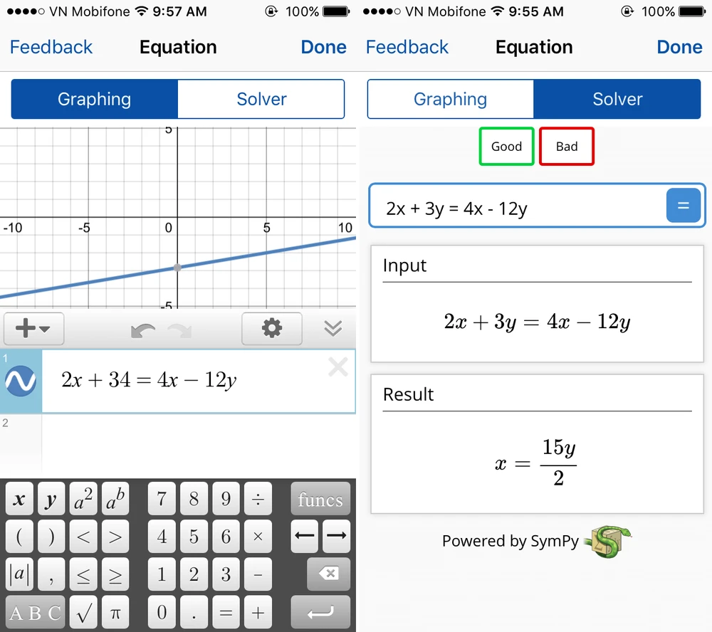 Tại đây sẽ có hai phần là Graphing (bài toán được diễn đạt dưới dạng đồ thị) và Solver (kết quả cuối cùng). Nếu chương trình nhận diện sai các con số hoặc ký tự, bạn có thể sửa lại dễ dàng. Người dùng có thể xuất các đồ thị thành hình ảnh và lưu lại trên Dropbox, iCloud hoặc lưu trực tiếp vào thư viện. Để xem kết quả, bạn chỉ cần chuyển sang mục Solver.