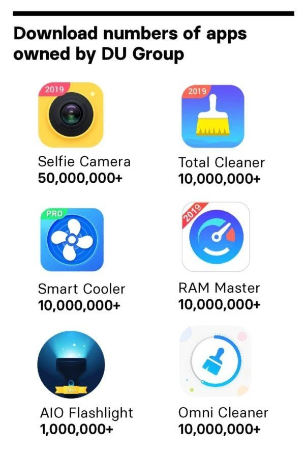 6 ứng dụng do DU Group phát triển đã được tải xuống 90 triệu lần trước khi bị Google gỡ bỏ do vi phạm chính sách. Đơn cử như ứng dụng Camera Selfie có hơn 50 triệu lượt tải xuống, những ứng dụng còn lại gồm Total Cleaner, Smart Cooler, RAM Master, Omni Cleaner có hơn 10 triệu lượt tải xuống, cuối cùng là AIO Flashlight với 1 triệu lượt tải xuống.