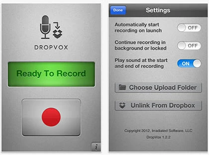 DropVox là một ứng dụng dành cho iOS, để ghi lại các âm thanh và giọng nói rồi gửi trực tiếp lên Dropbox dưới định dạng M4A. Cách sử dụng khá đơn giản, bạn chỉ cần nhấp vào nút Ready to Record để bắt đầu nói là được. Ứng dụng này có giá 1,99 USD (khoảng 42.000 VND) và đang được bán trên iTunes Store.