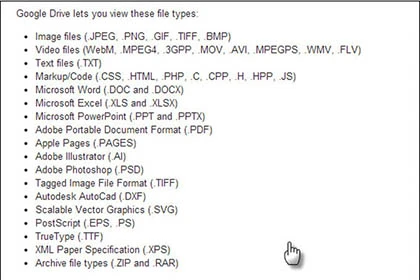 Google Drive hiện nay hỗ trợ tới 30 định dạng tập tin các loại, bao gồm CSS, HTML, PHP, C, CPP, HPP, JS, RAR, ZIP…Ngoài ra, nó còn có thể mở các tập tin của Adobe ILLustrator (AI) và các vector đồ họa mở rộng (SVG).