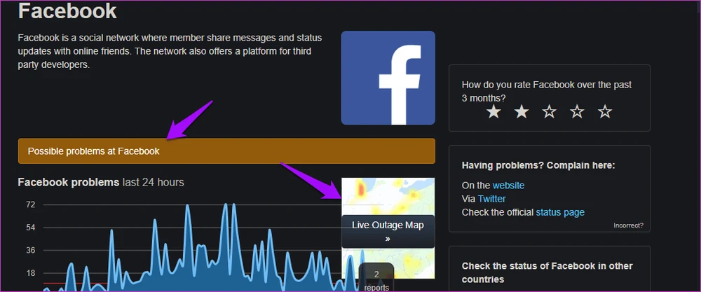 Việc Facebook gặp sự cố đã từng xảy ra nhiều lần trong quá khứ, lỗi có thể do máy chủ ngừng hoạt động hoặc bị mất điện. Để kiểm tra tình trạng hoạt động của Facebook, bạn hãy truy cập vào trang https://downdetector.com/.